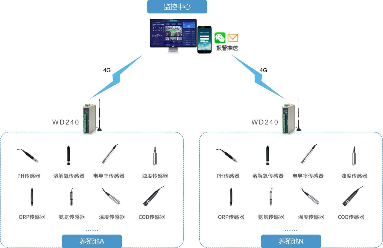 4、遠程控制:出現(xiàn)異常自動告警,并能設(shè)置增氧機、水泵等控制指令,保證水中的含氧活性,提高工作效率與管理水平。