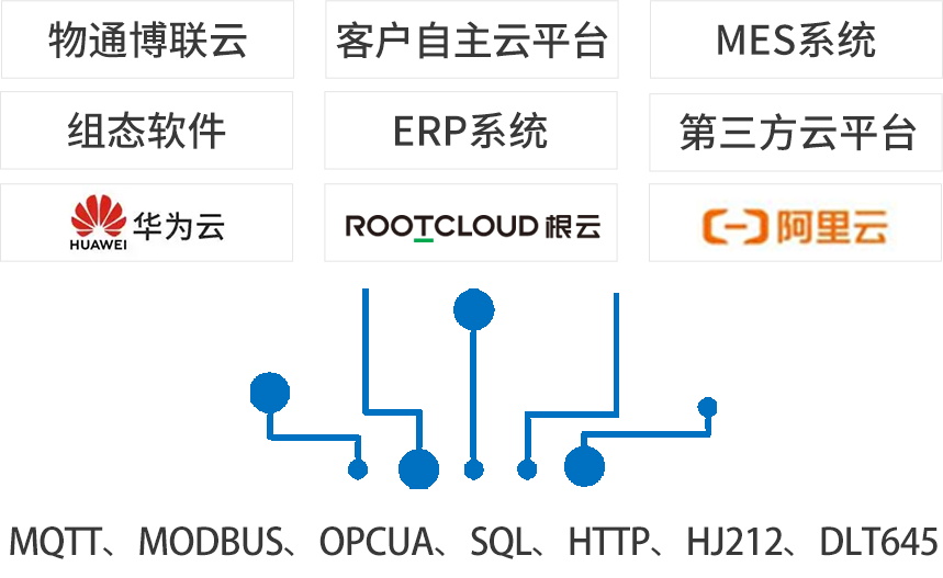 北向支持接入物通博聯(lián)云平臺(tái),客戶(hù)自主開(kāi)發(fā)的云平臺(tái),第三方云平臺(tái)(根云、美云、華為、阿里、百度、微軟等IOT云平臺(tái)),組態(tài)軟件、MES系統(tǒng)、行業(yè)監(jiān)控平臺(tái)等工業(yè)軟件