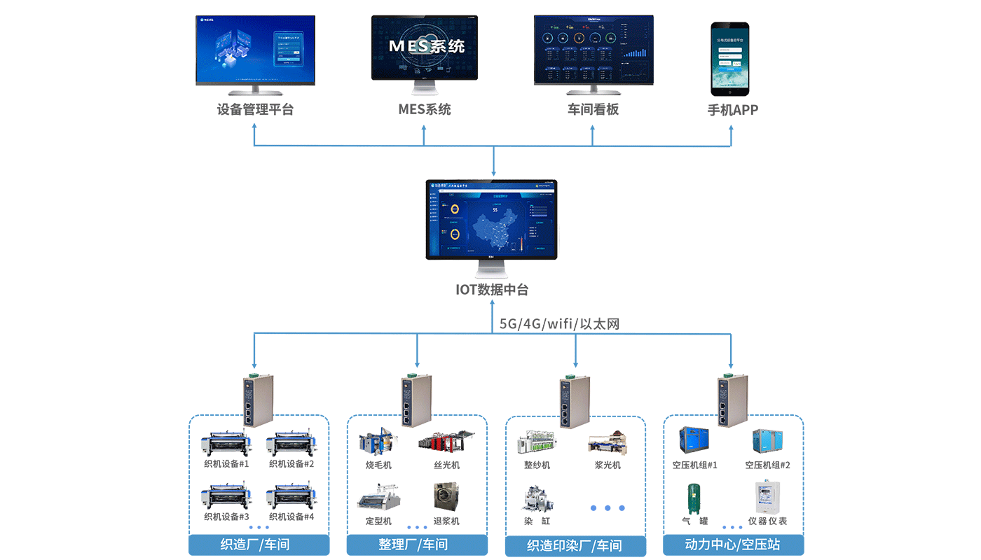 物通博聯推出了基于PLC物聯網技術的紡織工廠設備監(jiān)控運維系統(tǒng)解決方案。該系統(tǒng)通過工業(yè)智能網關與紡織機械的控制器PLC相連接,進行數據采集并以5G/4G、wifi、以太網等方式與物通博聯設備運維管理平臺實時通信,為設備管理、運維管理等方面提供高效便捷的管理手段。 網關也能將數據轉發(fā)到MES系統(tǒng),結合數據大屏分析各種設備狀態(tài)與生產參數,從而幫助制定科學合理的經營策略,助力紡織工廠的數字化轉型。